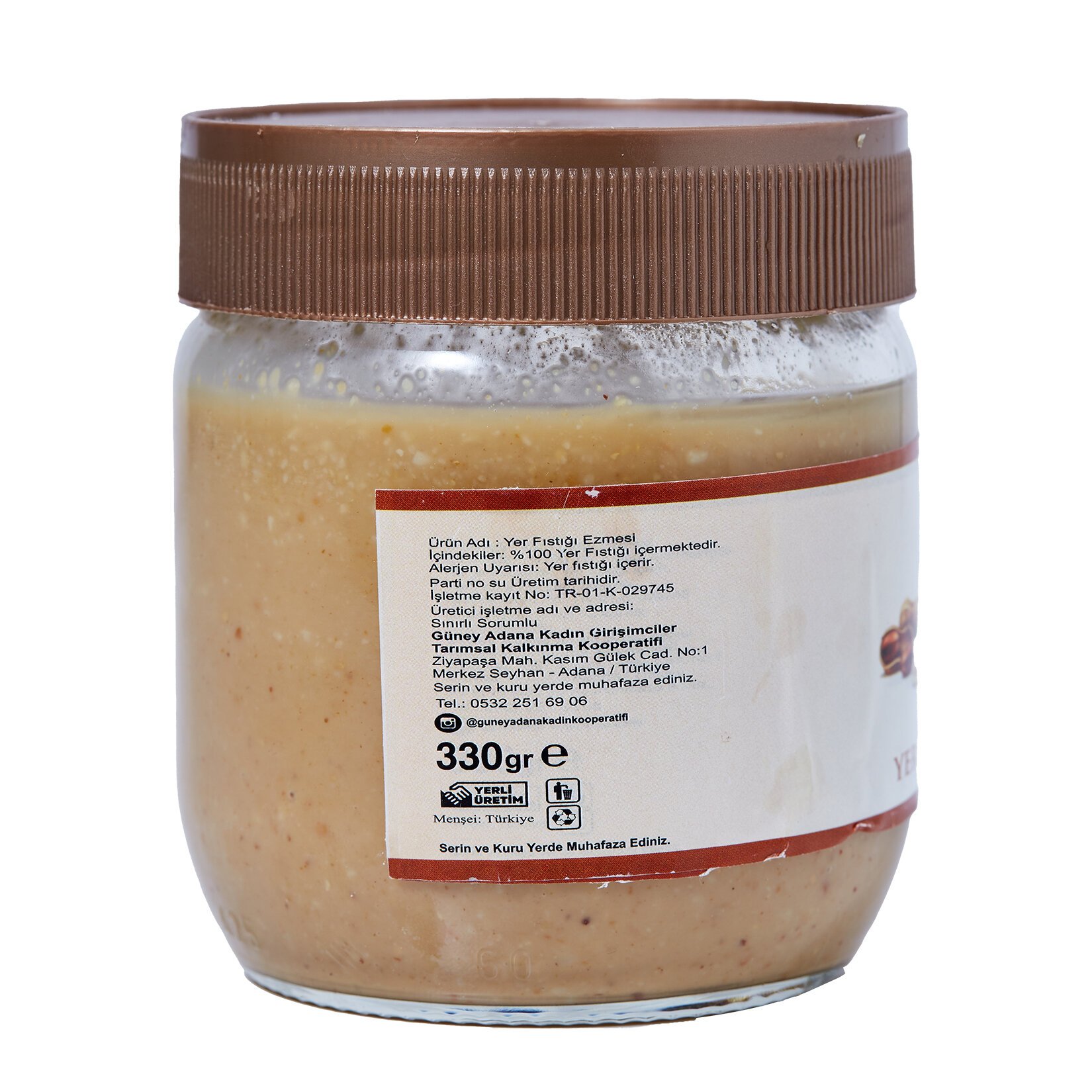Güney Adana Kadın Kooperatifi'nden, arkasında 25 ayrı kadın girişimcinin olduğu bir yer fıstığı ezmesi... Önce fırınlanıyor, ardından belli bir ısı ve sürede dinlendiriliyor ve sonra öğütme kazanına alınarak sürülebilir kıvam alana kadar öğütülüyor. Üretimi sırasında hiçbir katkı maddesi kullanımı olmayan, sıkma torbalardan kavanozlara doldurularak sofralara uzanan yer fıstığı ezmeniz, nefis ekmek üstü sürmelik lezzeti olarak kahvaltı sofralarının baş ucunda olmayı bekliyor.